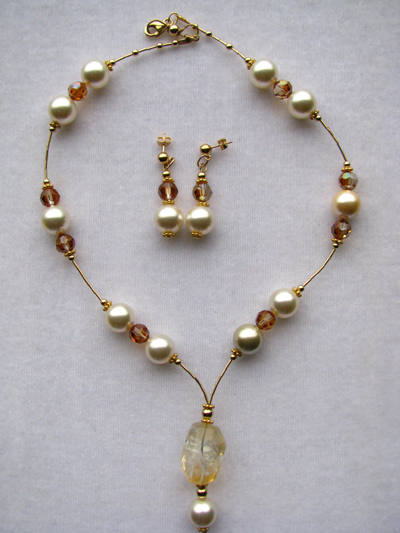 Citrine focal bead, Swarovski pearls and crystal, gold-filled spacers and findings. |  |