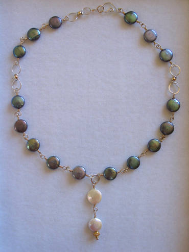 Deep ocean blue wire wrapped coin pearls, white wire wrapped coin pearl focal pendant, sterling and gold-fill findings and clasps. |