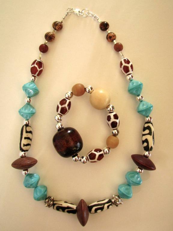 African-themed glass and wood beads, Bali silver and sterling silver findings. |  |