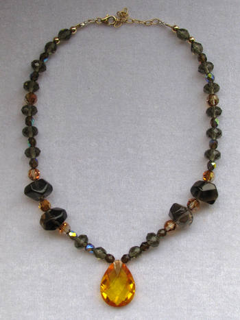 Faceted Czech crystal focal bead and spacers, faceted smoky quartz, gold-filled findings. |  |