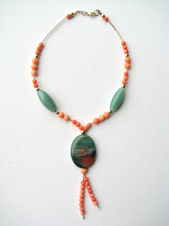 Agate focal bead, coral, glass beads, liquid gold and gold-filled findings. |  |