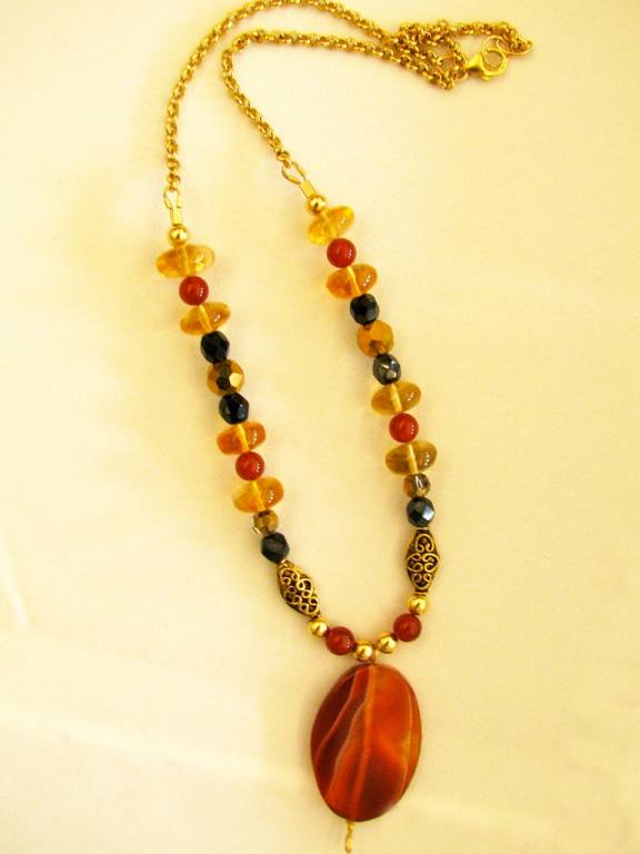 | Carnelian focal bead, pewter gold accent beads, carnelian and glass spacer beads, gold-filled findings. |  |