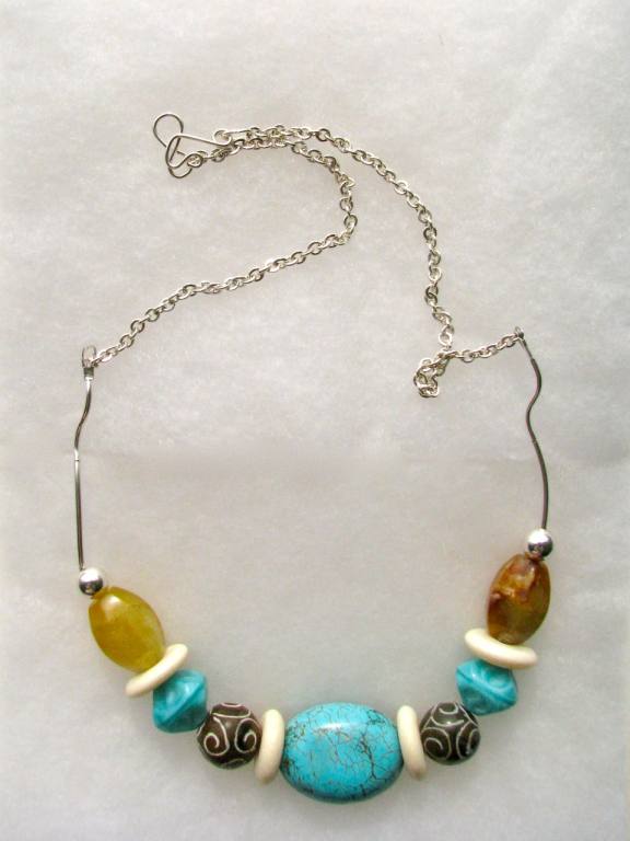 Turquoise focal bead, African bead spacers, agate and glass beads, sterling silver findings. |  |