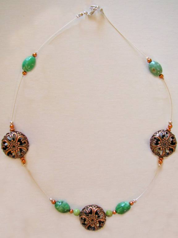 Brass stamped focal beads, African opals, copper spacer beads, sterling silver wire and findings. |  |