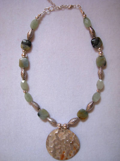 Shell focal bead, amazonite and aventurine, sterling silver spacers and findings. |