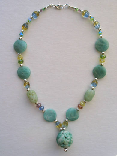 Carved 'new' jade focal bead and accent beads, amazonite disks, multicolor glass and crystal beads, sterling silver spacer beads and findings. |  |
