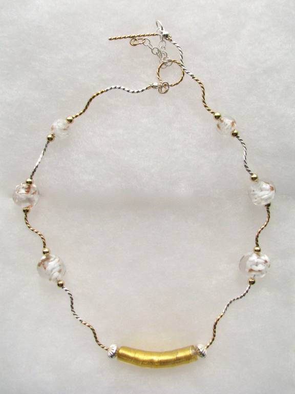 Foiled glass and Venetian glass focal beads and accents, sterling and gold-filled findings. |