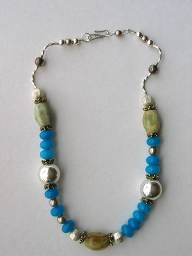 Flower jade, sterling silver spacers and accent beads, glass beads, sterling silver findings.