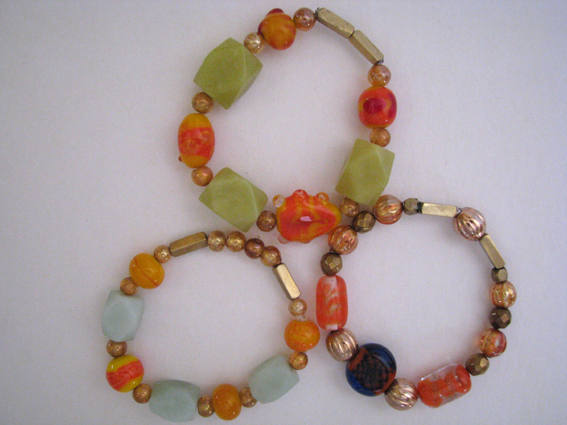 Assorted stretch bracelets with hand-made glass beads, aventurine, glass spacers, brass findings. |  |