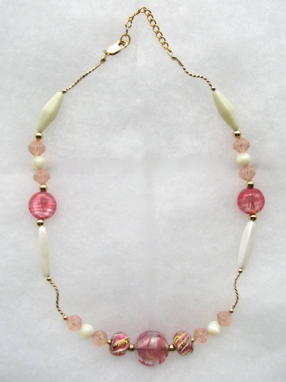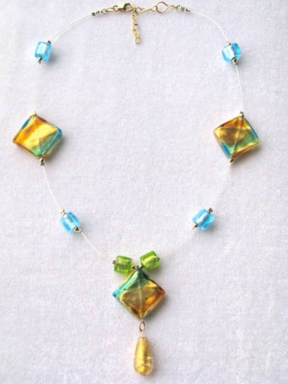 Venetian foiled glass, mother-of-pearl, glass beads and gold-filled findings. |