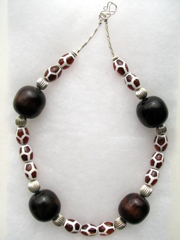 African-themed glass and wood beads, Bali silver and sterling silver findings. |  |