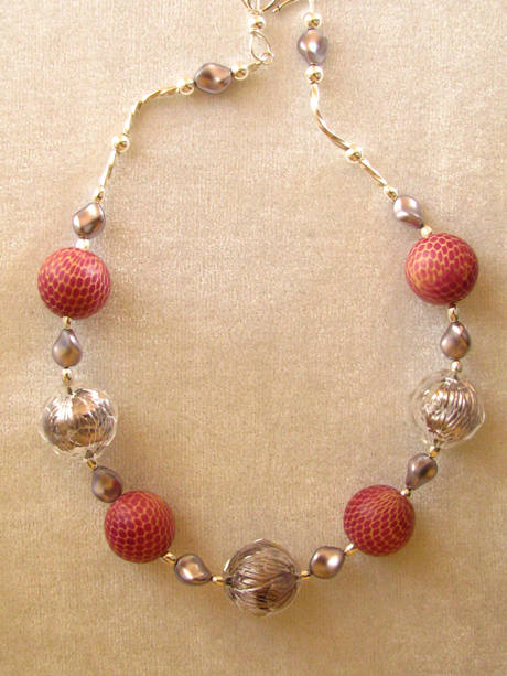 Glass disc focal beads, vintage Czech glass, pearls, sterling silver findings. |  |
