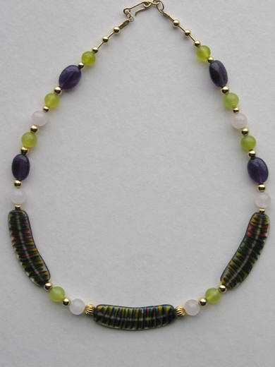 Glass feather focal beads, olive 'jade,' rose quartz, amethyst, gold-filled spacers and findings. |  |