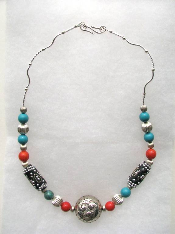 Bali silver focal bead, resin art beads from Europe, turquoise, Bali silver and sterling silver findings. |