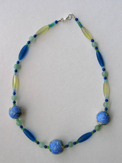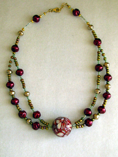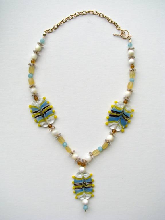 Foiled glass and Venetian glass focal beads and accents, sterling and gold-filled findings. |