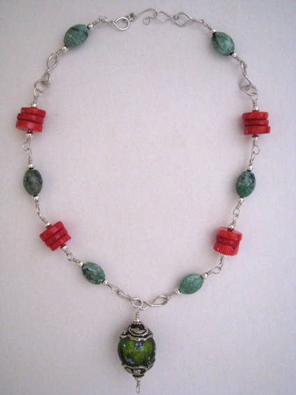 Bali silver/glass focal bead, African opals, Chinese coral slices, sterling silver wire wrapping and findings. |