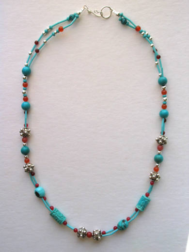Turquoise, carnelian, heishi beads, sterling silver beads and findings. |