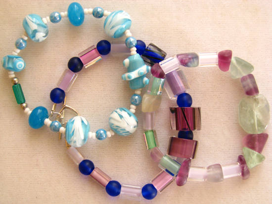 Assorted stretch bracelets with hand-made glass beads, aventurine, glass spacers, brass findings. |  |